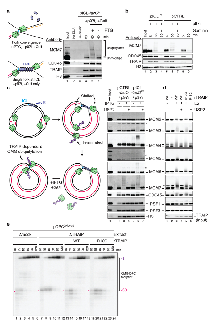 Fig. 2 |. TRAIP ubiquitylates CMGs that have converged at ICLsa, Left, experimental scheme. Plasmid containing an ICL flanked by 48 copies of the lac operator (lacO) (pICL-lacOPt) was incubated with Lac repressor (LacR) prior to replication in undepleted egg extract. After 30 min, IPTG addition dissociated LacR and allowed fork convergence. Right, pICL-lacOPt was recovered and blotted for the indicated proteins. Culi suppressed CRL2LRR1-dependent ubiquitylation.b, Chromatin-associated proteins during replication of pICLPt or pCTRL in undepleted extract in the presence or absence of the licensing inhibitor Geminin and p97i.c, Left, following CRL2LRR1-dependent unloading of CMGs that underwent termination on plasmids with multiple initiation events (see Extended Data Fig. 4d), release of the LacR array with IPTG leads to convergence of forks at the ICL, allowing analysis of TRAIP-specific ubiquitylation. Right, analysis of proteins associated with pICL-lacOPt during replication in the presence of p97i. MCM2 ubiquitylation was inferred from the increase in unmodified MCM2 upon USP2 treatment, which was used to remove all ubiquitin modifications. Asterisks, non-specifically detected proteins.d, Analysis of rCMG subunits incubated with rTRAIP in the presence of ubiquitin, E1, E2s UbcH5a/b/c, and ATP. MCM4 was present as full-length and degradation products. Asterisk, non-specifically detected protein.e, Nascent strand analysis of pDPC2ÃLead replicated in the indicated extracts. Red dot, combined footprint of CMG and the DPC in the presence of TRAIP. For TRAIP levels in extracts, see Extended Data Fig. 4c. |