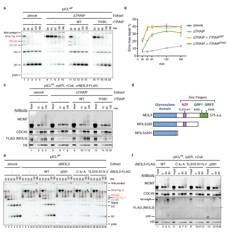 Fig. 3 |. TRAIP promotes NEIL3-dependent ICL repaira, pICLAP was replicated in the indicated extracts and analyzed as in Fig. 1b. Red dot, OC-OC catenane; Blue dot, OC-SC catenane. For TRAIP levels in extracts, see Extended Data Fig. 6c.b, Error-free repair of pICLAP was quantified as in Fig. 1f. Error bars, standard error of the mean from three independent experiments. For TRAIP levels in extracts, see Extended Data Fig. 6d.c and f, Analysis of proteins associated with pICLPt during replication in the indicated extracts (c) or undepleted extract (f) in the presence of p97i and Culi. Asterisk, non-specifically detected protein.d, Schematic of Xenopus NEIL3 proteins.e, pICLAP was replicated in the indicated extracts and analyzed as in Fig. 1b. ICL unhooking was estimated by quantifying OC and SC signal normalized to pQnt. For NEIL3 levels in extracts, see Extended Data Fig. 8c. |