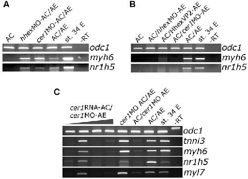 FIGURE 3. Cerberus and hhex are required in anterior endoderm for liver and cardiac specification. (A) Injection of cer1 or hhex MOs (10 or 20 ng/embryo, respectively) in AC have no effect on heart and liver marker expression in AC/AE conjugates. This is in contrast to (B), where injection of cer1 or hhex MOs in AE leads to downregulation of both cardiac and liver marker gene mRNA levels in conjugates. Injection of mRNA (500 pg/embryo) coding for dominant negative Hhex-VP2 construct had the same effect as hhex MO. (C) Cardiac and liver specification deficiency in AC/cer1 MO-AE conjugates can be rescued by Cerberus. cer1 mRNA was injected in AC at increasing concentrations, from left to right; 100, 200, 500, and 1000 pg per embryo. All samples were cultured until stage control had reached stage 34 where PCR was carried out for indicated markers.