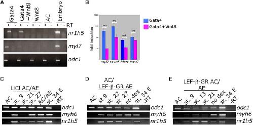 dkk-1 expression in AC/AE (injected in AC) likewise has no effect on nr1h5. RT-PCR analyses were performed on st. 34 explants and sibling embryo controls.