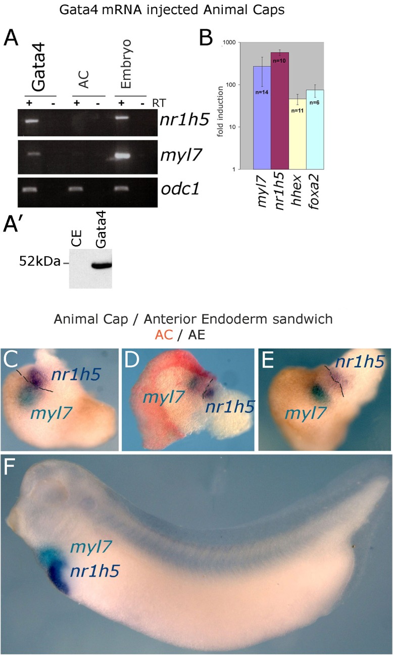 FIGURE 1. Induction of hepatogenesis in Gata4-expressing AC explants and AC/AE conjugates. (A,B) Marker gene analysis in Gata4-expressing animal caps. (A) RT-PCR showing expression of cardiac fate marker myl7, liver fate marker nr1h5 and control marker odc1 in Gata4 mRNA-injected ACs, control ACs and stage 33 sibling control embryo. Representative of four independent experiments. (Aâ²) Western blotting shows efficient translation of exogenous Gata4 protein. An equivalent of ½ embryo at st. 9 from a sample of five embryos has been loaded on the gel. (B) qPCR showing fold difference in expression between Gata4 treated animal caps and control animal caps grown to st. 33, induction of expression of myl7, nr1h5, hhex and marker of endodermfoxa2 is shown. Number of independent experiments (n) and standard error of the mean are shown. (CâE) Cardiac and liver domains are adjacent in AC/AE conjugates and (F) age matched sibling controls. AC/AE conjugates (sandwiches) were cultured until sibling control embryos reached st. 34 and were processed for myl7 expression (turquoise) and nr1h5 (purple) by WMISH. AC-derived tissue is shown in pink/red. Three AC/AE examples are shown demonstrating adjacent expression domains of myl7 in the AC-derived tissue and nr1h5 in the AE-derived component of the explant (12/12 specimens showed the same pattern). Dashed line highlights the border between AC and AE.