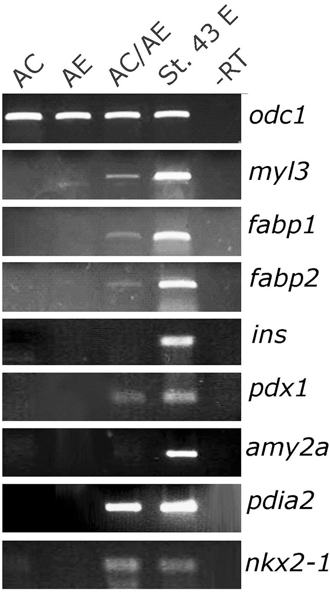 FIGURE 2. Endoderm diversification in AC/AE conjugates. Examination of gene expression in st. 43 AC/AE explants by RT-PCR reveals expression of liver (fabp1), intestine (fabp2), pancreas (pdia2 and pdx1, but not ins and amy2a), thyroid/lung (nkx2-1) as well as ventricular cardiomyocyte (myl3) markers. St. 43 E-sibling control embryo at st. 43.