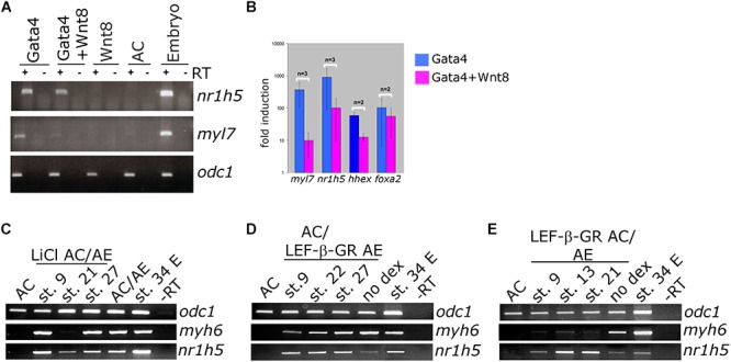 FIGURE 4. Differential effect of Wnt/beta catenin signaling activation on cardiac and liver cell fate. (A) Animal caps co-injected with Gata4 mRNA and Wnt8-expressing DNA show marked reduction of myl7 RNA levels and negligible effect on nr1h5 expression. (B) qPCR analysis confirms the findings of gel RT-PCR for myl7 and nr1h5 and in addition shows the reduction of hhex expression in Gata4 + Wnt8 samples. (C) AC/AE conjugates were treated with LiCl at indicated stages. Treatment at st. 21 blocked cardiac differentiation but had a lesser effect on liver specification. (D) Cell autonomous activation of Wnt/β-catenin signaling in LEF-β-GR mRNA-injected AE was achieved by adding dexamethasone (dex) to AC/AE conjugates at indicated stages. No effect on either heart or liver marker expression was observed. (E) In contrast, activation of LEF-β-GR in the AC part of the conjugates greatly reduced myh6 expression without affecting nr1h5. Explants were collected for RT-PCR analysis when sibling embryo controls reached st. 34.