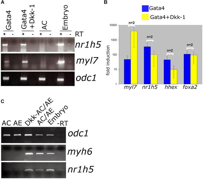 FIGURE 5. Wnt/β-catenin signaling is not required for liver specification in Gata4-AC and AC/AE. (A) Gata4 and dkk-1 mRNA co-injection in animal pole explants causes a well-described increase in cardiac marker levels but has no effect on nr1h5. (B) qPCR analysis confirms these findings and extends them by showing no significant effect on hhex and foxa2. (C)