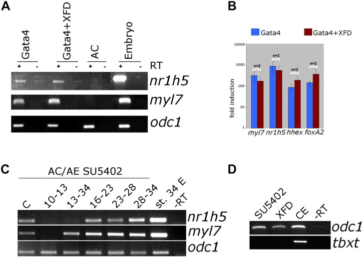 FIGURE 7. FGF signaling is not required for liver specification by Gata4 but is essential in AC/AE explants. (A) Gata4 and XFD (dominant-negative FGFR1) mRNA co-expression in animal pole explants has no effect on nr1h5 and myl7 expression. (B) qPCR analysis confirms these findings and extends them by showing no significant effect on hhex and foxa2. (C) Treatment of AC/AE with FGFR inhibitor SU5402 (50 μM) has stage-specific effect. Immediately upon AC/AE conjugate formation, SU5402 inhibits cardiac and liver gene expression. Treatment from st. 13 until the end of incubation at st. 34 has no effect on cardiogenesis but inhibits liver specification. Shorter time windows of treatment are largely without effect. Staging is according to the stage of AE (st. 10 at the time of conjugation). C-Control explants treated with 50 μM DMSO. (D) SU5402 and XFD are effective inhibitors of early mesodermal marker and FGF target gene tbxt. CE-control (untreated) sibling embryos. RT-PCR analyses were performed on st. 34 explants and sibling embryo controls.