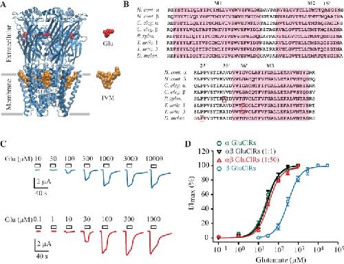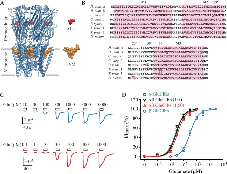 Fig 1. Activity of glutamate and IVM at homo- and heteromeric GluClRs.A. Structure of the GluClR (3RIF, [5]) showing the large extracellular domain with glutamate bound at interfaces between adjacent subunits. Also shown is the transmembrane domain, which consists of four helices (M1-M1) per subunit and IVM bound between the M1 and M3 of adjacent subunits. B. Sequence alignments of selected invertebrate GluClRs subunits showing the IVM binding site, which consists of the first (M1) to third (M3) transmembrane domains. Boxed in red are sites of missense mutations that reduce IVM sensitivity. Abbreviations are H. cont., H. contortus, C. eleg., C elegans, P. xylos., P. xylostella, T. urtic., T. urticae (isoforms 1 and 3) and D. melan., D. melanogaster. C. Example currents obtained in oocytes injected with the β subunit (above) or the α and β subunits (ratio 1:50, below) in response to the indicated glutamate concentrations. D. Group concentration-response data for the indicated GluClRs. Holding potential was –40 mV.