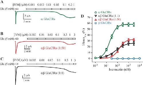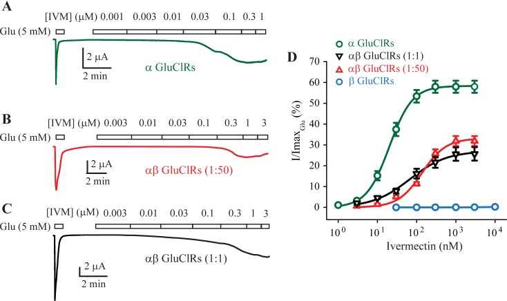 Fig 2. Activity of IVM at homo- and heteromeric GluClRs.(A-C) Representative concentration-response experiments at the indicated IVM concentrations in oocytes. IVM-induced currents were normalised to the response elicited by a saturating concentration of glutamate (5 mM) for oocytes injected with cDNA encoding the α subunit (A) or α and β subunits at a ratio of 1:50 (B) or 1:1 (C). D. Group concentration-response data for the indicated GluClRs. Holding potential was −40 mV.