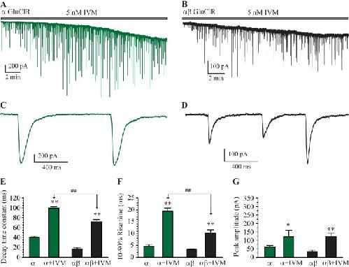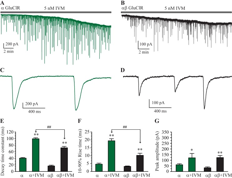 Fig 5. Effects of IVM at IPSCs mediated by α and αβ GluClRs.(A-B). A whole-cell recording from a HEK293 cell expressing α GluClRs (A) or αβ GluClRs (B) in co-culture with primary neurons in the continuous presence of 5 nM IVM. Note the steady increase in inward tonic current, which reaches a steady-state plateau at about 17 min in both (A) and (C). C. Expanded view of a segment from (A) showing isolated IPSCs, which have larger peak amplitudes and rise and decay more slowly than the corresponding IPSCs in the absence of IVM. D. Expanded view of a segment from (B) showing isolated IPSCs, which have larger peak amplitudes and rise and decay more slowly than the corresponding IPSCs in the absence of IVM. Note that the peak amplitude is smaller and the rise and decay times are faster than those in (C). E-G. Group bar plot showing the mean IPSC decay time constant (E), 10–90% rise times (F) and peak amplitude (G) of α and αβ GluClRs in the presence and absence of IVM. ** p < 0.01, * p < 0.05, ## p < 0.01. Holding potential was −70 mV.