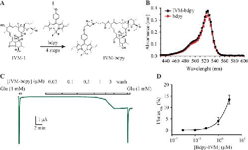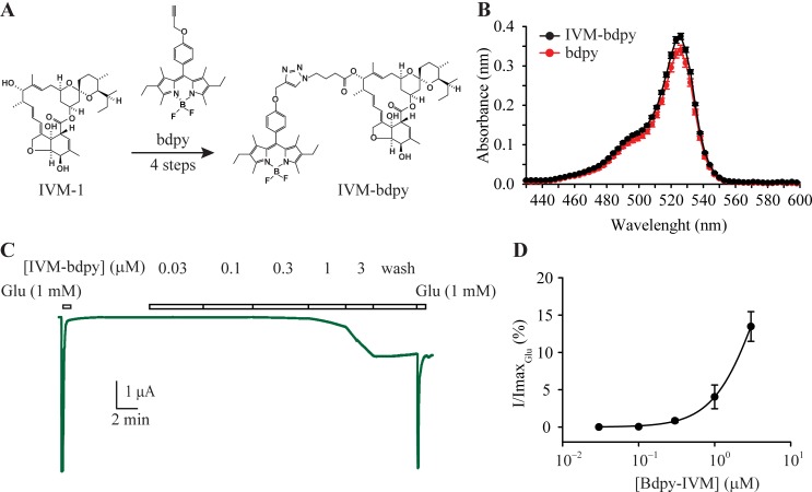 Fig 7. IVM-bdpy fluorescent probe.A. Structures of free bdpy fluorophore and IVM-bdpy. B. The spectral emission properties of IVM-bdpy and the free bdpy fluorophore. C. IVM-bdpy retained activity as shown in the sample oocyte current mediated by α GluClRs. D. Group concentration-response plot (n = 6) for IVM-bdpy at α GluClRs, showing reduced potency relative to IVM.