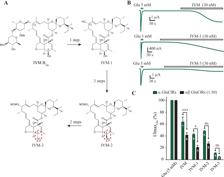 Fig 3. IVM analogue potency.A. Structures of IVM and the three analogues. Arrows indicate the synthesis reaction steps. MOMO represents a methoxymethyl ether group. A red broken border indicates the change in 5-OH configuration between IVM-2 and IVM-3. B. Example experiments in oocytes expressing α GluClRs that test IVM and analogues, IVM-1 and IVM-3. The IVM or analogue-induced current was normalised to the response elicited by a saturating concentration of glutamate (5 mM). C. Group bar plots comparing the potency between α and αβ (1:50) GluClRs for IVM and the three IVM analogues. *** p < 0.001, * p < 0.05. Numbers within the bars indicate the number of experiments (oocytes). Holding potential was −40 mV.