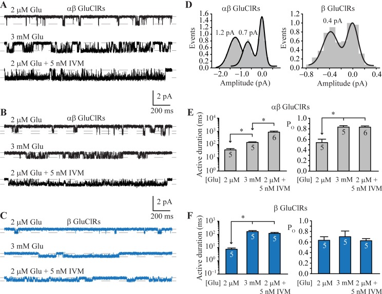 Fig 6. Single channel properties of α and αβ GluClRs.A. Single receptor currents from patches expressing αβ (1:1) GluClRs at 2 μM and 3 mM glutamate and 2 μM glutamate plus 5 nM IVM. Note the increase in the duration of the active periods in the presence of IVM. B. Transfections of α and β subunits produced two distinct types of single channel activity based on current amplitude (1.2 and 0.7 pA). The 1.2 pA activity was the most prominent, accounting for 90% of the openings. The active durations of both types increase at higher glutamate concentrations and in the presence of IVM. C. Single receptors currents mediated by β GluClRs in the presence of the indicated concentrations of glutamate and in 2 μM glutamate plus 5 nM IVM. Note only one amplitude level (0.4 pA). D. Amplitude histograms for single receptor activity from patches expressing αβ GluClRs showing the two main amplitude levels (left) and β GluClRs (left). E. Single receptor mean active period durations (left) and intra-activation open probability (right) for αβ GluClRs in response to the indicated ligands. F. Single receptor mean active period durations (left) and intra-activation open probability (right) for β GluClRs in response to the indicated ligands. * p < 0.05. Numbers within the bars indicate the number of experiments (patches). Holding potential was −70 mV.