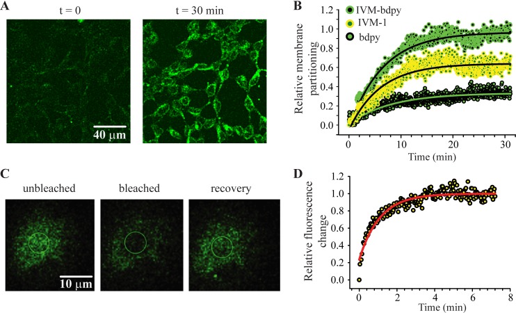 Fig 8. Membrane partitioning and lateral diffusion of IVM-bdpy.a. Confocal image of a field of HEK293 cells before (left) and after 30 min exposure of 500 nM IVM-bdpy (right). B. Group plot (n = 5) of the change in fluorescence over time for IVM-bdpy (green) the free bdpy fluorophore (black) and the subtraction (IVM-1, yellow). These plots were fitted to exponential functions to yield time constants of 6.5 min for the IVM-bdpy, 8.2 min for the bdpy fluorophore and 6.0 min for IVM-1. C. An example of a FRAP experiment showing a cell after equilibrating in 500 nM IVM-bdpy for 30 min (left), after a circular region (demarcated) was pholobleached with laser energy (middle) and after recovery of the bleached region (right). D. Group plot (n = 5) of the rate of recovery after pholobleaching. The data were fitted to an exponential with a time constant of 1.3 min.