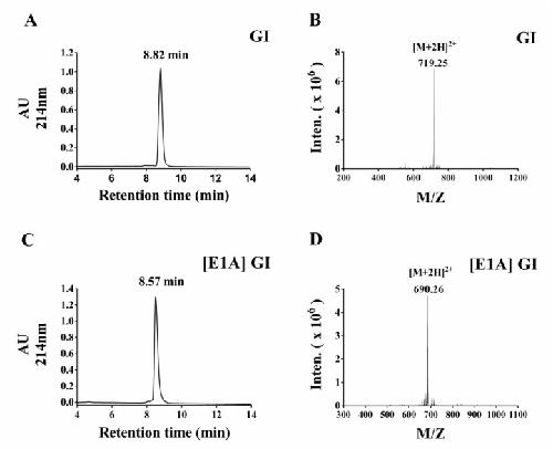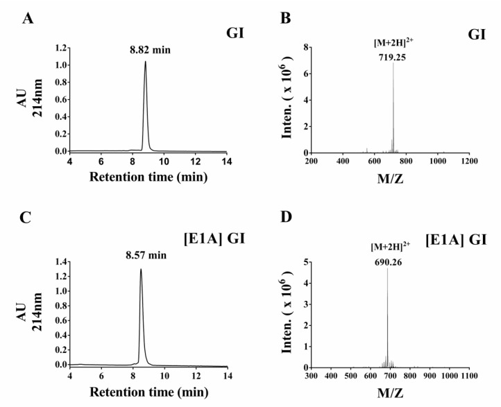 Figure 2. The HPLC and ESI-MS profiles of α-conotoxin GI and α-conotoxin [E1A] GI. The peptide GI and [E1A] GI were analyzed on a reverse-phase analytical Vydac C18 column with a solvent gradient from 5% buffer B to 40% buffer B for 20 min where buffer A = 0.075% trifluoroacetic acid (TFA), remainder H2O and buffer B = 0.050% TFA, 90% acetonitrile, remainder H2O. The absorbance was monitored at 214 nm. (A) The HPLC chromatogram of fully oxidized peptide GI; (B) ESI-MS data for GI with an observed monoisotopic mass of 1436.50 Da; (C) the HPLC chromatogram of fully folded peptide [E1A] GI; (D) ESI-MS data for [E1A] GI with an observed monoisotopic mass of 1378.52 Da.