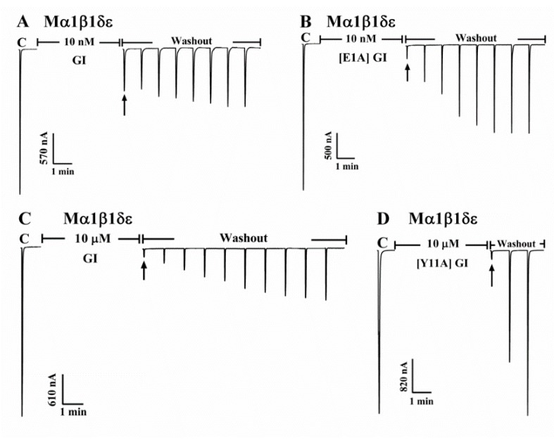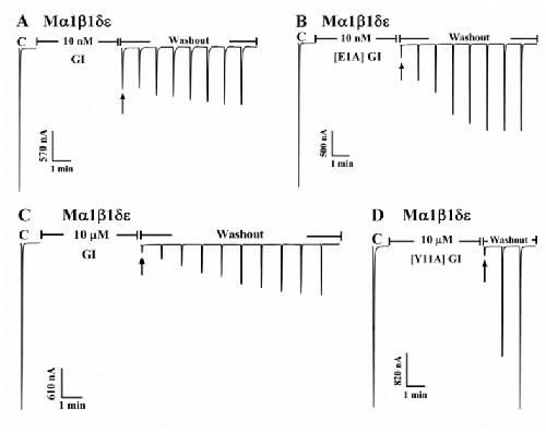 Figure 4. Blockade of mouse α1β1δε nAChR by GI, [E1A] GI and [Y11A] GI. Representative current traces showing the inhibition of mouse α1β1δε ACh-evoked currents by GI and [E1A] GI at the concentration of 10 nM (A, B), GI and [Y11A] GI at the concentration of 10 μM (C, D). Xenopus laevis oocytes expressing a given mouse α1β1δε nAChR were at a holding potential of â70 mV and were subjected to a 1 s pulse of ACh every minute as previously described [30]. After control responses to ACh, the oocyte was exposed to toxins for 5 min (arrow). The toxin was then washed out and the response to ACh was again measured. âCâ indicates control responses to ACh.