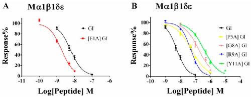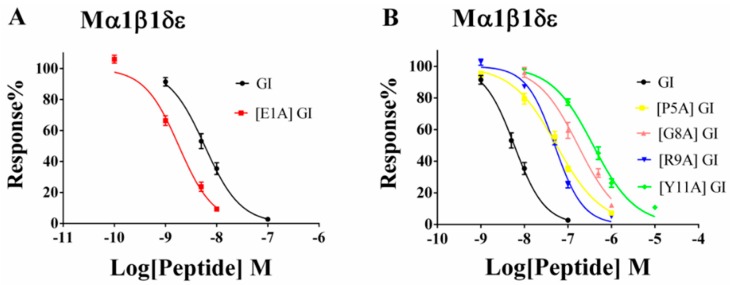 Figure 5. The concentrationâresponse curves of mouse α1β1δε nAChR subtype for GI and alanine-substituted analogues. (A) The concentrationâresponse curves for GI and [E1A] GI. peptide [E1A] GI shifted the curves to the left, relative to the parent peptide GI. (B) The concentrationâresponse curves for GI, [P5A] GI, [G8A] GI, [R9A] GI and [Y11A] GI. [P5A] GI, [G8A] GI, [R9A] GI and [Y11A] GI were towards the right compared to the native GI. All data represent mean ± S.E.M, n = 7â10.