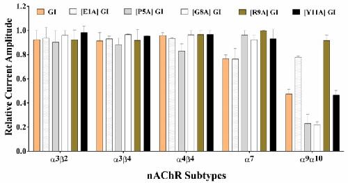Figure 6. The effect of GI and alanine analogues on different nAChR subtypes expressed in Xenopus laevis oocytes. These mutations were determined at the concentration of 10 μM. A bar graph of the inhibition of nAChR subtypes by GI and its analogues. All data represent mean ± S.E.M, n = 4–6.
