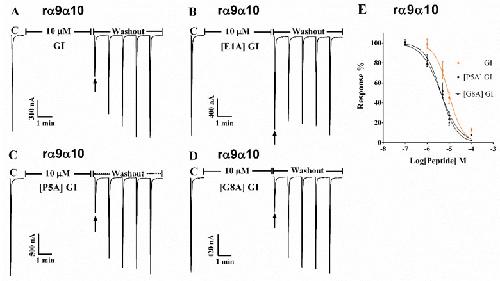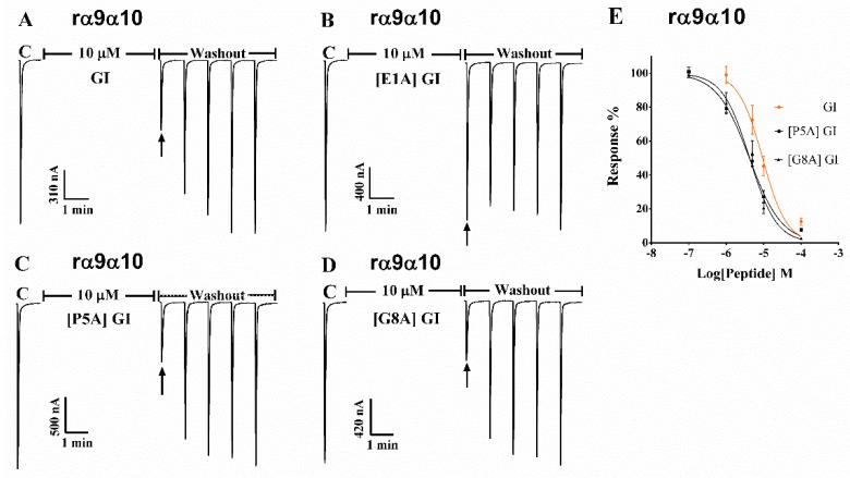 Figure 7. α-conotoxin GI and its analogues were tested on neuronal rat α9α10 nAChR subtype expressed in Xenopus laevis oocytes. The representative current traces showing the inhibition of rat α9α10 ACh-evoked currents by GI (A), [E1A] GI (B), [P5A] GI (C) and [G8A] GI (D) respectively. Oocytes were clamped at −70 mV holding potential, and membrane currents were evoked with 10 μM ACh. The inhibition of GI, [E1A] GI and [P5A] GI for rat α9α10 nAChR was 48.4%, 10.5%, 72.3% and 69.8% at the concentration of 10 μM respectively. (E) Concentration–response curves for GI, [P5A] GI and [G8A] GI. All data in (E) represent mean ± S.E.M, n = 5–8.