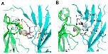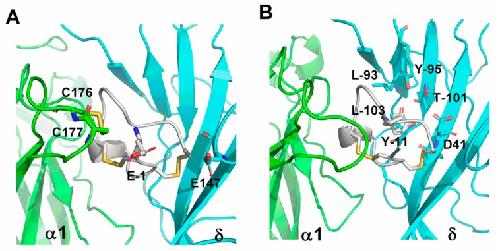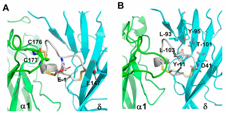 Figure 8. MD stimulations indicate the binding modes of GI to the interface of αδ subunit respectively. (A) Amino acids around 5 Å radius of the Glu-1 of GI are labeled. (B) Amino acids around 4 Å radius of the Tyr-11 of GI are labeled. The α1(+) subunit is shown in green, δ(−) subunit in cyan and the peptides GI in white.