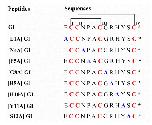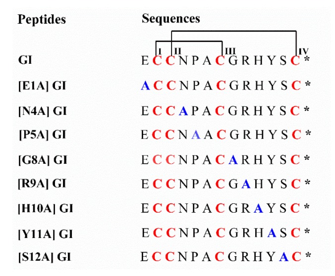 Figure 1. Sequences of α-conotoxin GI and its analogues. Each substituted alanine is labeled in bold and blue. The connectivity of Cysteine (CysI-CysIII, CysII-CysIV) is marked in bold and red. * indicates a C-terminal amide.