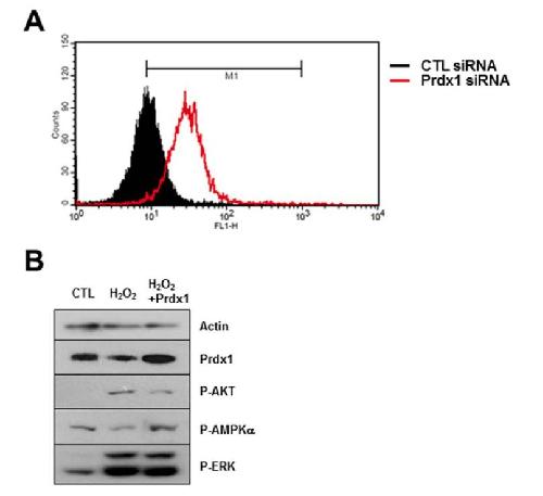 A. Endogenous ROS levels in MDCK cells transfected with either 10 nM prdx1 or control siRNAs were measured using flow cytometry. The cellular ROS level was higher in prdx1 siRNA-transfected cells than in control siRNA-transfected cells.