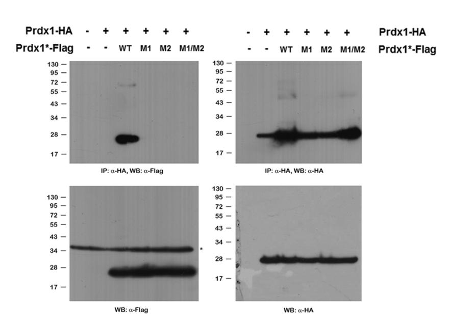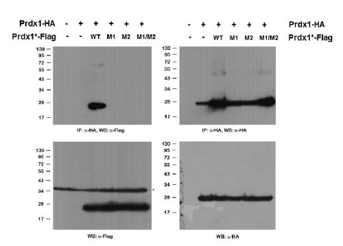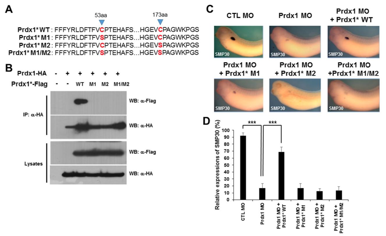 Figure 2. Conserved cysteines in Prdx1 are essential for pronephros development. (A) Three prdx1 mutants, namely, C53S (M1), C173S (M2), and C53S/C173S (M1/2), were subcloned using PCR-based site-directed mutagenesis. (B) Flag-tagged Prdx1* or HA-tagged prdx1 (200 pg) was co-injected into both blastomeres of two-cell stage embryos. Lysates from stage 12 embryos were used for immunoprecipitation. WT Prdx1 only showed in immune complex whereas mutant Prdx1 did not. (C) prdx1 MOs (40 ng) were co-injected with WT or mutant prdx1 (M1, M2 or M1/M2) into both blastomeres of two-cell stage embryos. Embryos at the stage 33 were used for whole-mount in situ hybridization, and proximal tubules in the pronephros were visualized with a smp30 probe. Inhibited proximal tubule formation in prdx1 morphants was rescued by WT prdx1 but not with mutant prdx1* RNAs. (D) Graphical demonstration of smp30 expression in embryos co-injected with WT or mutant prdx1 (M1, M2 or M1/M2) and prdx1 MOs compared with the controls.