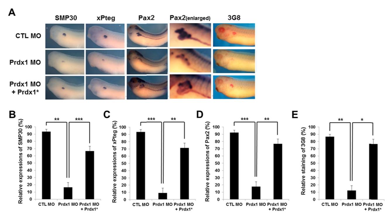 Figure 1. Inhibition of proximal tubule formation in the pronephros by the loss of Prdx1 and its rescue by Prdx1* RNA co-injection. (A) prdx1 MOs (40 ng) were injected into both blastomeres of two-cell stage embryos. Embryos at the stage 33 were used for whole-mount in situ hybridization and immunohistochemistry. Proximal tubules in the pronephros were visualized by whole-mount in situ hybridization using smp30, xPteg, and pax2 probes and by immunohistochemistry using a 3G8 antibody. Expression of the proximal tubule-specific markers smp30 (B), xPteg (C), and pax2 (D) in prdx1 MO-injected embryos compared with the controls. Co-injection with prdx1* RNA rescued the decreased expression. The immunohistochemistry for 3G8 patterns were similar with whole-mount in situ hybridization (E). prdx1 morphants exihibited inhibition of proximal tubule formation only while intermediate, distal and connecting tubules were not affected by loss of prdx1.