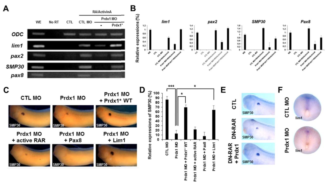 Figure 3. Prdx1 functions downstream of the RA signaling pathway during proximal tubule formation in the pronephros. (A) prdx1 MOs (40 ng) were injected into both blastomeres of two-cell stage embryos. Animal caps were removed from the injected embryos at the stage 8.5 and incubated with 10 ng/mL activin A, followed by 10â4 M all-trans RA for 3 h. Animal caps were collected from embryos at the stage 33 and used for RT-PCR. RT-PCR results showed the significant reduced expression of lim1, pax2, smp30, and pax8 in prdx1 MO-injected as compared with RA/activin induced. The decreased expression of pronephros markers was rescued by prdx1* RNA. Ornithine decarboxylase (odc) was used as the loading control. A no-RT template in the absence of reverse transcriptase was used as the control. WE, whole embryo; CTL, control animal caps; CTL MO, control MO-injected animal caps. (B) RT-PCR examination of lim1, pax2, smp30 and pax8 expression was confirmed by real time PCR. Significant lower expression level was observed for pronephros markers in the prdx1 MO-injected embryos that was rescued by co-injection with prdx1* RNA except for pax8. WE, whole embryo; CTL, control animal caps; CTL MO, control MO-injected animal caps. (C) prdx1 MOs (40 ng) were co-injected with wild-type prdx1, RARα-vp16 (active rar), pax8, or lim1 (400 pg) into both blastomeres of two-cell stage embryos. Embryos at the stage 33 were used for whole-mount in situ hybridization, and proximal tubules in the pronephros were visualized with a smp30 probe. The pronephros abnormalities of prdx1 morphants were rescued by lim1 mRNA co-injection but not by the activation of active RA receptors or pax8. (D) Graphical representation of pronephros development in prdx1 MO-injected embryos and embryos co-injected with lim1, active RA receptors and pax8 compared to the control embryos (injected with control MO). Pronephros defects were significantly rescued by lim1 mRNA co-injection. (E) Embryos at two-cell stage were injected with dominant-negative retinoic acid receptor (DN-RAR) with or without prdx1. DN-RAR-inhibited pronephros development was rescued by prdx1 overexpression. (F) Expression of pronephros marker lim1 was observed at stage 12.5 in embryos injected with CTL MO and prdx1 MO. lim1 expression was dramatically reduced in Prdx1 morphants.