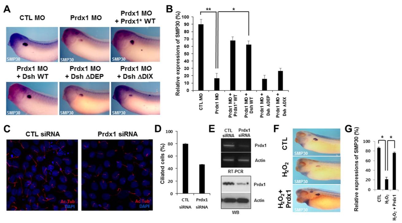 Figure 4. Prdx1 regulates pronephrogenesis via the Wnt signaling pathway by modulating ROS levels in X. laevis embryos. (A) prdx1 MOs and WT prdx1*, WT Dsh (Dsh WT), DshδDEP, or DshδDIX were co-injected into both blastomeres of two-cell stage embryos. Embryos at the stage 33 were used for whole-mount in situ hybridization, and proximal tubules in the pronephros were visualized with a smp30 probe. Pronephros development recovered only in embryos co-injected with WT prdx1* or Dsh WT. (B) Graphical demonstration of pronephros development in embryos co-injected with prdx1 MOs and WT prdx1*, Dsh WT, DshδDEP, or DshδDIX. (C) MDCK cells were transfected with either 10ânM prdx1 or control siRNAs. Primary cilia were visualized using an acetylated-tubulin (Ac-Tub) antibody. Cell nuclei were stained with DAPI. Numbers of cilia cells were markedly reduced in MDCK cells by prdx1 siRNA mediated knockdown of prdx1. (D) Graphical representation of ciliated cells transfected with control siRNA and prdx1 siRNA. prdx1 knockdown significantly reduced the number of cilia in MDCK cells. (E) Specificity of prdx1 knockdown in MDCK cells transfected with Prdx1siRNA was confirmed by RT-PCR examination as well as western blot studies. Significant reduction in levels of prdx1 mRNA and proteins was observed in MDCK cells transfected with Prdx1siRNA. (F) Control and prdx1-injected (200âpg) embryos were treated with 2âμM H2O2 at stage 8.5. Embryos at the stage 33 were used for whole-mount in situ hybridization, and proximal tubules in the pronephros were visualized with a smp30 probe. H2O2-disrupted proximal tubule formation in the pronephros, and abnormal proximal tubule formation was rescued in Prdx1-injected embryos. (G) Graph showing the pronephros development in embryos co-treated with H2O2 and prdx1. Reduced expression of smp30 in H2O2 treated embryos was rescued by prdx1.