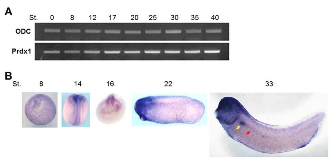 A. Xenopus embryos were harvested at various stages and RT-PCR was performed using standard methods. The Numbers indicate the embryonic stages. odc was used as the loading control. The expression of prdx1, a maternal gene, gradually increased from the blastula to