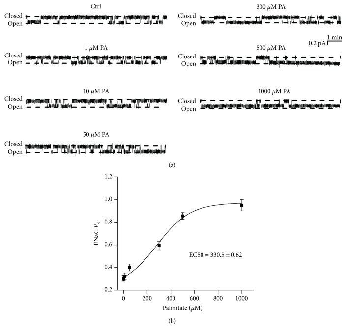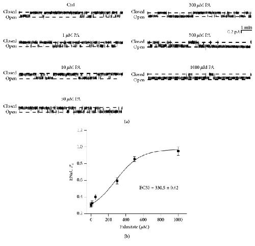 Figure 2. Palmitate (PA) stimulates ENaC activity in a dose-dependent manner. (a) Representative ENaC single-channel currents recorded in A6 cells under control conditions or treated with palmitate at concentrations of 1, 10, 50, 300, 500, and 1000 μM. (b) ENaC PO was plotted as a function of each corresponding concentration of palmitate and fitted with pharmacology standard curves. Analysis was performed using SigmaPlot (n = 6 for each data point).