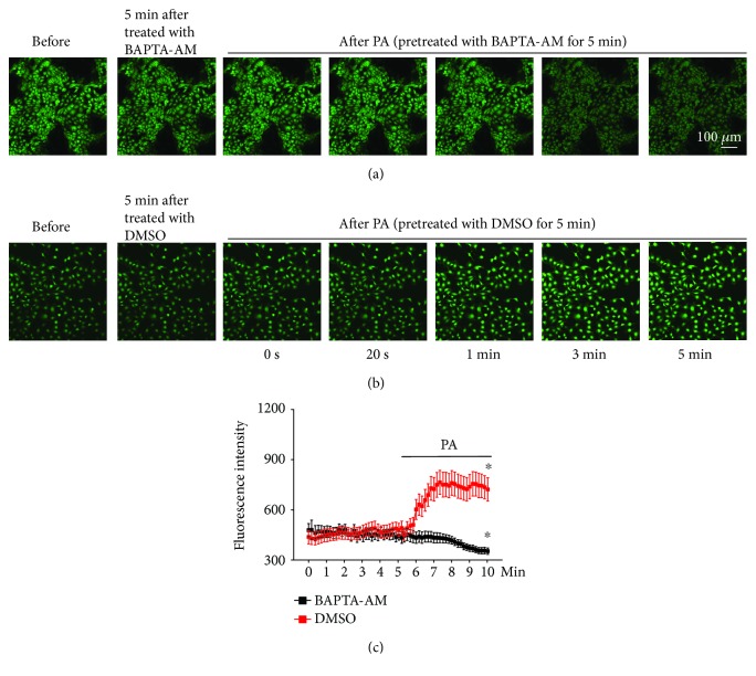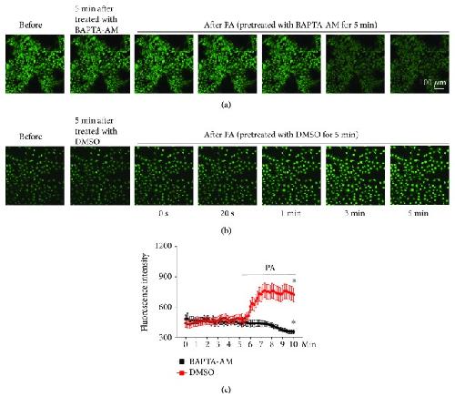 Figure 5. Palmitate elevates intracellular ROS via a Ca2+-dependent mechanism. (a) Representative confocal microscopy images of A6 cells, which were loaded with DCF (an ROS indicator), under control conditions (before), 5 min after treatment with BAPTA-AM (10 μM), and after application of palmitate to the basolateral bath in the presence of BAPTA-AM. (b) A6 cells under control conditions (before), 5 min after treatment with DMSO (vehicle control), and after application of palmitate to the basolateral bath. (c) Summary plots of fluorescence intensity of DCF indicating the levels of intracellular ROS (n = 6; ∗P < 0.05, compared with the control). Each point was 8 cells randomly selected from each image in six sets of separate experiments.