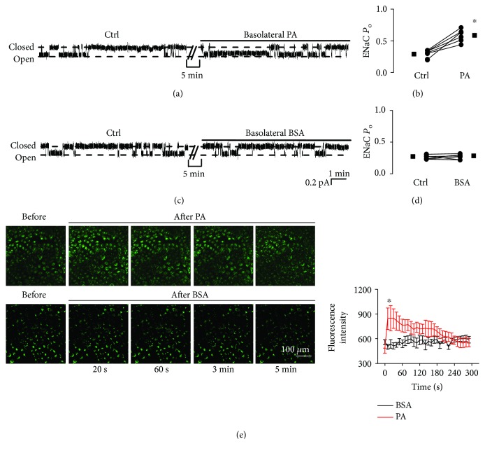 Figure 1. Palmitate increases ENaC activity and elevates intracellular Ca2+ levels in A6 cells. (a and c) Representative ENaC single-channel current recorded from A6 cells before and after application of either 0.3âmM palmitate (PA) or 2% BSA to the basolateral bath. (b and d) Summary plots show that palmitate significantly increased ENaC PO (n = 7 for each experimental treatment; âP < 0.05), but BSA did not affect ENaC PO. (e) Left panel shows representative confocal microscopy images of A6 cells, which were loaded with Fluo-3, AM (a Ca2+ indicator), before and after application of either palmitate or BSA to the basolateral bath. Right panel shows summary plots of fluorescence intensity of Fluo-3 indicating the levels of intracellular Ca2+ (n = 7 for each individual experimental treatment; âP < 0.05). Note: in patch-clamp experiments, all the responses had approximately 5âmin latency. Therefore, in all the figures, we omitted 5âmin recordings after each experimental manipulation.