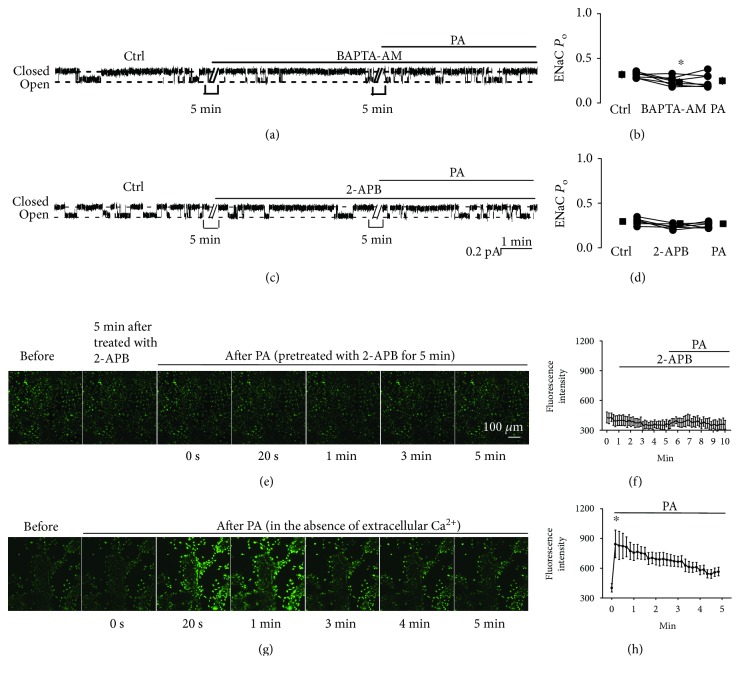 Figure 3. Palmitate stimulates ENaC via a Ca2+-dependent mechanism. (a) Representative ENaC single-channel current recorded from an A6 cell before and after application of BAPTA-AM (a membrane-permeable Ca2+ chelator; 10 μM) and palmitate (0.3 mM) to the basolateral bath. (b) Summarized ENaC PO before and after the application of different reagents (n = 6; ∗P < 0.05, compared with the control). (c) Representative single-channel ENaC current recorded from an A6 cell before and after application of 2-APB (an inhibitor of IP3 receptors which inhibits store-operated calcium release; 100 μM) and palmitate (0.3 mM) to the basolateral bath. (d) Summarized ENaC PO before and after application of different reagents (n = 6; P > 0.05, compared with the control). (e) Representative confocal microscopy images of A6 cells, which were loaded with Fluo-3, AM (a Ca2+ indicator), under control conditions (before), 5 min after treatment with 2-APB, and after application of palmitate to the basolateral bath. (f) Summary plots of fluorescence intensity of Fluo-3 indicating the levels of intracellular Ca2+. Each point was averaged from 8 images. Data are from six separate experiments. (g) Representative confocal microscopy images of A6 cells, which were loaded with Fluo-3, AM, before (in the absence of extracellular Ca2+) and after application of palmitate to the basolateral bath. (h) Summary plots of fluorescence intensity of Fluo-3 indicating the levels of intracellular Ca2+. Each point was averaged from 8 images. Data are from six separate experiments.