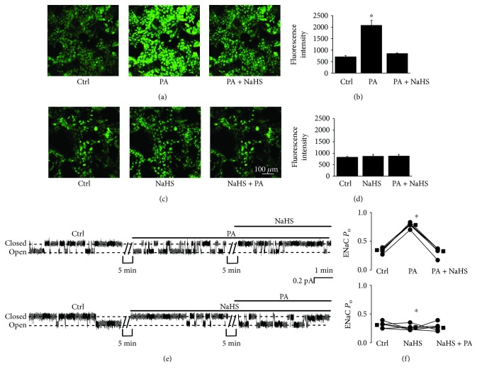 Figure 4. NaHS abolishes palmitate-induced oxidative stress and ENaC activation. (a and c) Confocal microscopy images of A6 cells loaded with DCF, an ROS indicator, before and either after application of palmitate (0.3 mM) first, then NaHS (0.1 mM), or after application of NaHS (0.1 mM) first, then palmitate (0.3 mM), to the cells. (b and d) Summary plots of fluorescent intensity under each condition as indicated. Data are from six independent paired experiments (n = 6 for each individual experimental set; ∗P < 0.05, compared with the control group). (e) Representative ENaC single-channel current recorded from two A6 cells before and either after addition of 0.3 mM palmitate first, then 0.1 mM NaHS (upper trace), or after addition of 0.1 mM NaHS first, then 0.3 mM palmitate, to the basolateral bath. (f) Summarized ENaC PO under each condition, as indicated (n = 6 for each individual experimental treatment; ∗P < 0.05, compared with the control treatment group).