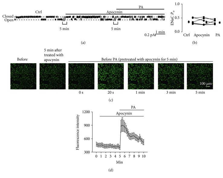 Figure 6. Apocynin abolishes palmitate-induced ENaC activity but does not affect intracellular Ca2+. (a) Representative ENaC single-channel current recorded from an A6 cell before and after addition of 0.1 mM apocynin first, then 0.3 mM palmitate to the basolateral bath. (b) Summarized ENaC PO before and after application of different reagents (n = 6; P > 0.05). (c) Representative confocal microscopy images of A6 cells, which were loaded with Fluo-3, AM (a Ca2+ indicator), under control conditions (before), 5 min after treatment with apocynin, and after application of palmitate to the basolateral bath. (d) Summary plots of fluorescence intensity of Fluo-3 indicating the levels of intracellular Ca2+. (n = 6; ∗P < 0.05, compared with the control).