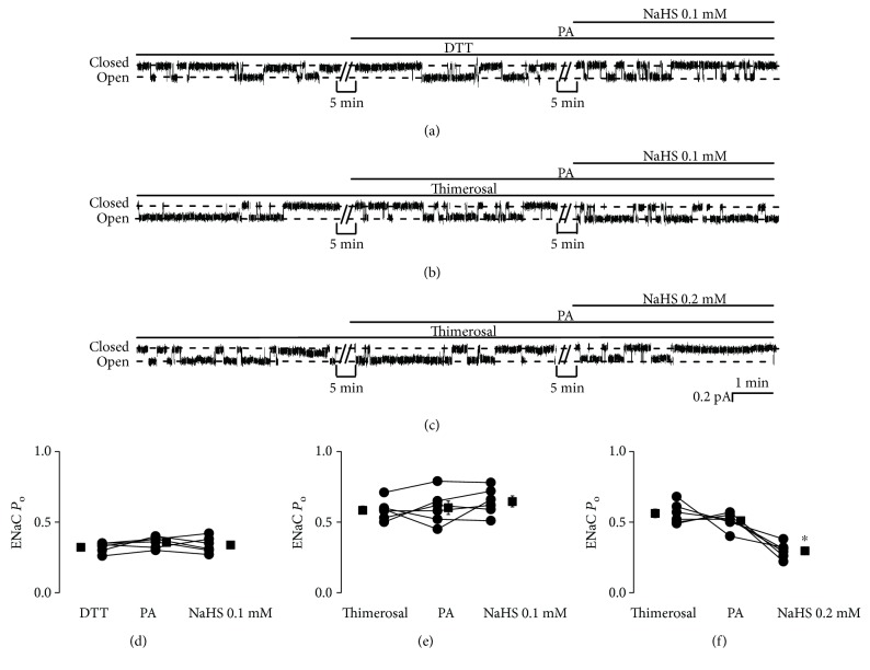 Figure 7. Palmitate stimulates ENaC via a redox-dependent mechanism. (a–c) Representative ENaC single-channel current recorded from A6 cells. Either DTT (a reducing agent, 1 mM) or thimerosal (an oxidizing agent, 100 μM) was first added to the basolateral bath. Then, palmitate was added before application of NaHS (0.1 mM) to the basolateral bath. (d–f) Summarized ENaC PO under each condition, as indicated (n = 6 for each individual experimental set; ∗P < 0.05 compared with thimerosal and palmitate treatments).