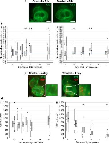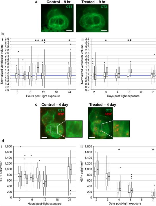 FIGURE 1 Light induction of tadpoles with KillerRed expression in the heart induces transient ventricular hypertrophy and cardiomyocyte proliferation. (a) The ventricle of KillerRedâexpressing/light activated tadpoles (Treated) is enlarged at 9 hr relative to sibling control hearts. Immunohistochemistry for cardiac troponin T (CT3). Scale bar = 100 μm. (b) (i) The volume of KillerRedâexpressing tadpole ventricles exposed to green light (Treated), normalized to uninjected stageâmatched sibling controls (Control), increases significantly over that of control ventricles in a period between 9 and 24 hr after removal from light. n = 35â162 tadpoles, N = 2â6 replicates. (ii) Ventricular volume increases significantly in treated tadpoles over controls at 3 and 5 days postâlight exposure. n = 19â60 tadpoles, N = 1â3 replicates. (c) The number of proliferating cells in the ventricular myocardium in KillerRedâexpressing/light activated tadpoles (Treated) increases at 4 days relative to sibling control hearts. Histone H3 pâSer10 (H3P) positive loci were used to mark proliferating nuclei, and cardiac troponin T (CT3) was used to determine whether proliferating cells were cardiomyocytes. H3P+ cells were counted within a randomly selected region in the ventricle (inset). Scale bar = 100 μm. (d) (i) There is no change in cardiomyocyte proliferation in KillerRedâexpressing hearts exposed to light, as measured by density of H3P+ positive loci in the ventricle, relative to control hearts in the first 24 hr after light exposure. n = 15â49 tadpoles, N = 1â2 replicates. (ii) Proliferation increases significantly in KillerRedâexpressing and lightâactivated tadpole hearts over uninjected stageâmatched sibling controls at two time points, 4 and 7 days postâlight exposure. n = 11â38 tadpoles, N = 1â2 replicates. *p < 0.05; **p < 0.01 (tât e s t w i t h H o l m c o r r e c t i o n ) . â¡ C o n t r o l ,Treated