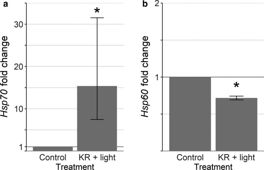 FIGURE 3 Expression of heat shock protein genes is highly modulated early in the damage response. (a) Hsp70 is upregulated 15‐fold in KillerRed and light‐treated hearts over uninjected controls at 3‐hr post‐light exposure (*p < 0.05, Kruskal–Wallis test). Changes in Hsp70 expression were measured relative to Eef1aexpression as an endogenous control. Error bars indicate SEM of dCt values. n = 5–10 tadpoles per replicate, N = 3 replicates. (b) Hsp60 is downregulated in KillerRed and light‐treated hearts to 70% of expression levels in uninjected controls at 3‐hr post‐light exposure (*p < 0.05, Kruskal–Wallis test). Changes in Hsp60expression were measured relative to Eef1a expression as an endogenous control. Error bars indicate SEM of dCt values. n = 5–10 tadpoles per replicate, N = 3 replicates