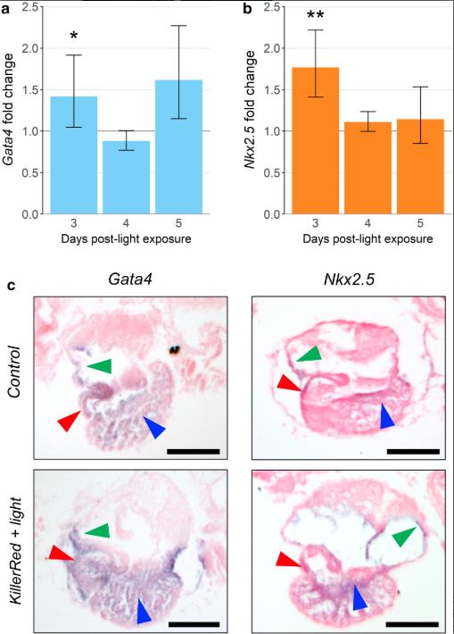 Figure 4. Cardiac progenitor genes are upregulated at 3 days postâlight activation. (a) KillerRedâexpressing tadpole hearts exposed to light show a significant increase in expression of Gata4 relative to uninjected controls at 3âdays postâlight exposure (*p < 0.05; KruskalâWallis test). Changes in Gata4 expression were measured relative to Eef1a expression as an endogenous control. Error bars indicate SEM of dCt values. n = 10 tadpoles per replicate, N = 6 replicates. (b) KillerRedâexpressing tadpole hearts exposed to light show a significant increase in expression of Nkx2.5 relative to uninjected controls at 3 days postâlight exposure (**p < 0.01; KruskalâWallis test). Changes in Nkx2.5 expression were measured relative to Eef1a expression as an endogenous control. Error bars indicate SEM of dCt values. n = 10 tadpoles per replicate, N = 5 replicates. (c) In situ hybridization for Gata4 and Nkx2.5 shows that there is no change in which tissues these genes are expressed in following light activation of KillerRedâexpressing tadpole hearts. Both genes are expressed, among other tissues, in the myocardium of the ventricle (blue arrow), the myocardium of the outflow track (red arrow), and the inner lining (endocardium or apical myocardium) of the atrium (green arrow). Representative images from 3 days postâlight activation are shown here. Scale bar = 100 μm. Section thickness = 10 μm