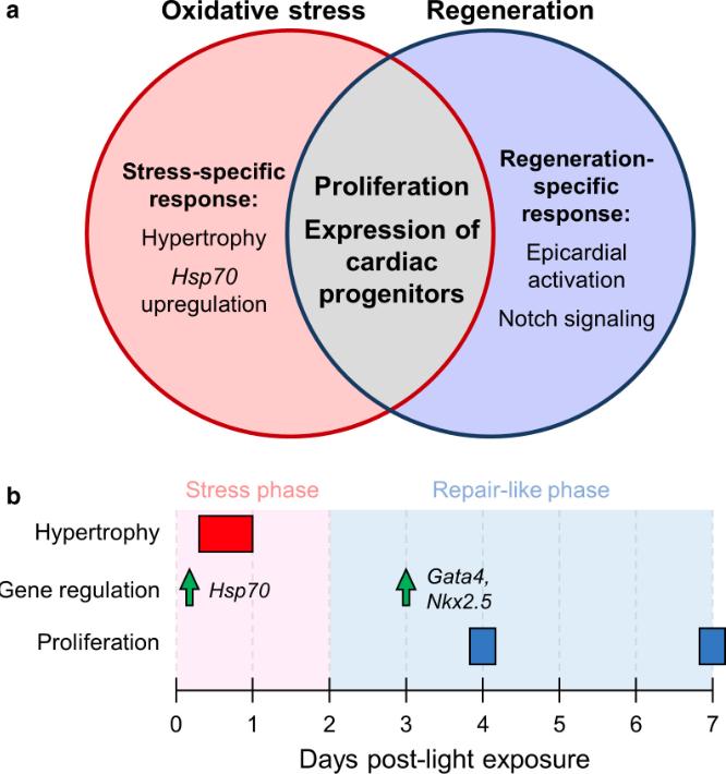 Figure 7. Xenopus laevis cardiac repair shares elements of the mammalian stress response and the urodele/fish regenerative response. (a) The cardiac response of X. laevis tadpoles to oxidative stress shares elements with the stereotyped cardiac regeneration response, but each pathway also contains unique mechanisms not shared by the other. (b) The X. laevis cardiac repair response can be divided into two phases, a stress phase dominated by ventricular hypertrophy and upregulation of Hsp70, and a repair‐like phase dominated by re‐expression of cardiac development genes and cardiomyocyte proliferation