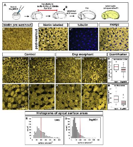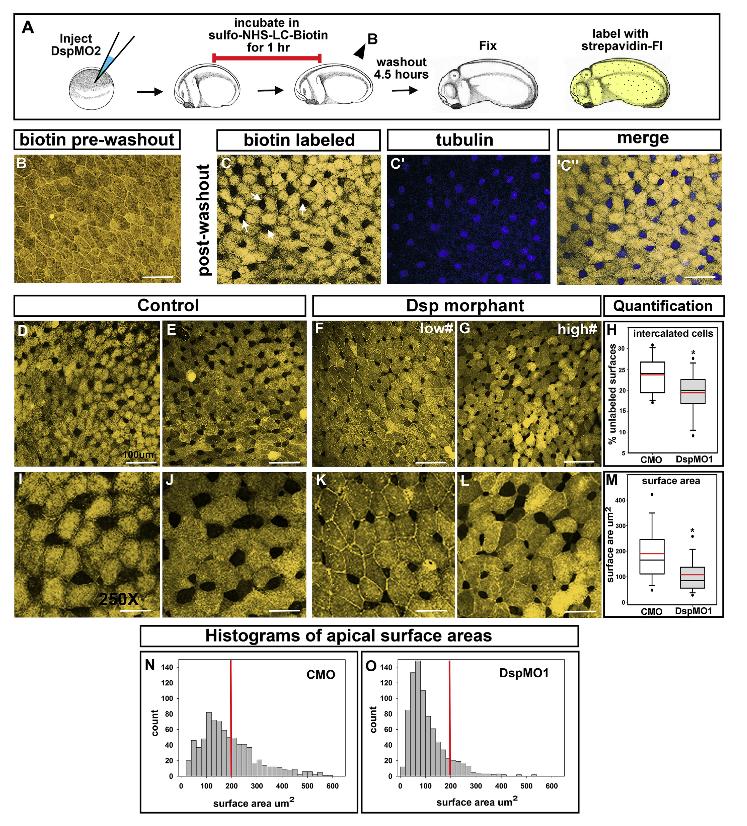 Fig. 5. Tracking the epidermis. A) Schematic of outer epidermis labeling experiment. B) Representative image of trunk epidermis labeled with biotin directly after labeling without a washout period. Scale bar = 40 μm. C-Câ²) Representative image of trunk epidermis double labeled with biotin (C) and tubulin (blue, Câ²) and merge (Câ²). Scale bar = 40 μm. D-E) Two representative images of trunk epidermis from a control embryos after labeling with biotin. Scale bars = 45 μm. F-G) Two representative images of trunk epidermis from a DspMO1 morphant embryos after labeling with biotin. Scale bars = 45 μm. H) Quantification of the percentage of unlabeled cells in DspMO1 morphants compared to controls. Red line represents the mean. * = statistical significance. I-J) Two representative images of trunk epidermis from a control embryos after labeling with biotin at higher magnification. Scale bars = 20 μm. K-L) Two representative images of trunk epidermis from a DspMO1 morphant embryos after labeling with biotin at high magnification. Scale bars = 20 μm. M) Quantification of the relative change in surface area of unlabeled cells in DspMO1 morphants compared to controls. Red line represents the mean. * = statistical significance. N-O) Histogram analysis of surface areas of unlabeled cells in control (N) and DspMO1 (O). The red line indicates the surface area of 200 μm2 for comparisons. |