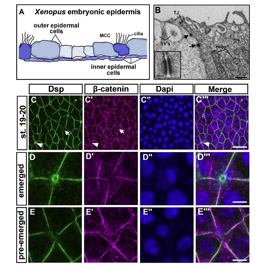 Fig. 1. Desmosomes and desmoplakin in the epidermis of X. laevis embryos. A) Schematic showing a transverse section of the X. laevis embryonic epidermis based on actual histological sections. B) TEM images where black arrows indicate desmosomes located between outer epidermal cells. Scale barâ¯=â¯1.8â¯Î¼m. Inset shows higher magnification of a desmosome. Scale barâ¯=â¯135â¯nm. C-Dâ´) Immunofluorescence of Dsp and beta-catenin in the epidermis. Dapi labeling of the nuclei was used as a counter stain. C-Câ´) st. 19â20, in H arrows indicate regions where there is a less Dsp labeling and arrowheads indicate where there is enrichment of Dsp labeling. The same cells are indicated in panel Câ². Scale barâ¯=â¯27â¯Î¼m. D-Dâ´) High magnification of a cell that appears to be apically emerging with high levels of Dsp and lower beta-catenin. Scale barâ¯=â¯6â¯Î¼m. D-Dâ´) High magnification of a cell that appears to be beginning to intercalate and has low levels of Dsp. Scale barâ¯=â¯6â¯Î¼m. Abbreviationsâ¯=â¯MCCâ¯=â¯multiciliated cell, SVsâ¯=â¯secretory vesicles, mitoâ¯=â¯mitochondria, TJâ¯=â¯tight junction, oeâ¯=â¯outer epidermis, ieâ¯=â¯inner epidermis. |