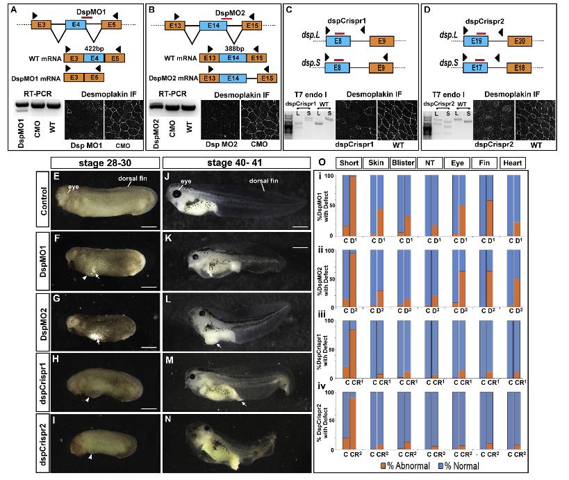 Fig. 2. Decreased function of Dsp in the embryo. (A) Schematic showing where the DspMO1 (red bar) is predicted to bind to dsp.L mRNA as well as the predicted spliced products in Dsp morphants and controls. Black arrow heads indicate the region of primer sequences used for RT-PCR analysis. RT-PCR of dsp showing there is an alternative splice product in the DspMO1 morphants. Immunofluorescence of desmoplakin (white) in DspMO1 and CMO morphants. (B) Schematic showing where the DspMO2 (red bar) is predicted to bind to dsp.L mRNA as well as the predicted spliced products in Dsp morphants and controls. Black arrow heads indicate the region of primer sequences used for RT-PCR analysis. RT-PCR of dsp showing there is an alternative splice product in the DspMO1 morphants. Immunofluorescence of desmoplakin (white) in DspMO2 and CMO morphants. (C) Schematic showing where the dspCrispr1 (red bars) is predicted to target the dsp.L and dsp.S genes. Black arrow heads indicate the region of primer sequences used for mutation analysis. Results of a T7 endonuclease assay are shown of dspCrispr mutants showing there is an alternative product indicative of mutation. Immunofluorescence of desmoplakin (white) in dspCrispr mutants and controls. (D) Schematic showing where the dspCrispr2 (red bars) is predicted to target the dsp.L and dsp.S genes. Black arrow heads indicate the region of primer sequences used for mutation analysis. Results of a T7 endonuclease assay are shown of dspCrispr mutants showing there is an alternative product indicative of mutation. Immunofluorescence of desmoplakin (white) in dspCrispr mutants and controls. E-I) Lateral view of control, Dsp morphants and mutant embryos at stage 28â30. Anterior is to the left. Arrows indicate regions where the epidermis is broken and arrowheads point to blister like structures. Scale barsâ¯=â¯450â¯Î¼m. J-N) Later view of control, Dsp morphants and mutant embryos at stage 40â41. Anterior is to the left. Arrows indicate regions where the epidermis is broken and arrowheads point to blister like structures. Scale barsâ¯=â¯450â¯Î¼m. O) Analysis of phenotypic frequency in i) DspMO1 morphants (D1), ii) DspMO2 morphants (D2), iii) dspCrispr1 mutants (Cr1), dspCrispr2 mutants (Cr2) compared to controls (C). Orange indicates percentage with the defect indicated at the top. Abbreviations: WTâ¯=â¯wildtype uninjected sibling embryos, Eâ¯=â¯exon, IFâ¯=â¯immunofluorescence. |