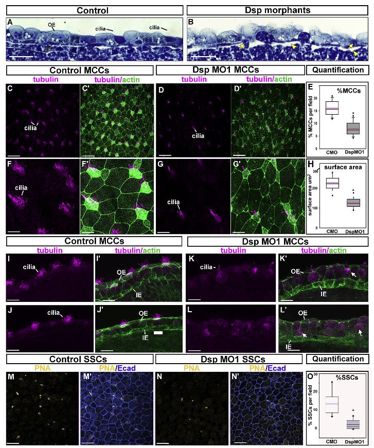 Fig. 4. Decreased Desmoplakin results in abnormal epidermal morphology, MCC and SSC development. A-B) Histological sections of the epidermis in control (A) and DspMO1 morphants (B). Yellow arrowheads indicate space underlying the epidermis. Scale bars = 45 μm. C-Câ²) Representative control trunk epidermis labeled with tubulin (C), phalloidin and tubulin (Câ²). Scale bars = 50 μm. D-Dâ²) Representative DspMO1 trunk epidermis labeled with tubulin (D), phalloidin and tubulin (Dâ²). Scale bars = 50 μm. E) Quantification of the percentage of tubulin positive cells in control compared to DspMO1 morphants. * = statistical significance. F-Fâ²) Representative control trunk epidermis labeled with tubulin (F), phalloidin and tubulin (Fâ²). 2X magnified region of C and Câ. Scale bars = 11 μm. G-Gâ²) Representative DspMO1 trunk epidermis labeled with tubulin (G), phalloidin and tubulin (Gâ²). 2X magnified region of D and Dâ. Scale bar = 11 μm. H) Quantification of the surface area of tubulin positive cells in control compared to DspMO1 morphants. * = statistical significance. I-Jâ²) Sections of two representative control trunk epidermis labeled with tubulin (I,J), phalloidin and tubulin (Iâ²,Jâ²). Scale bars = 22 μm. K-Lâ²) Sections of two representative DspMO1 trunk epidermis labeled with tubulin (J), phalloidin and tubulin (Gâ²). Scale bar = 22 μm. M-Mâ²) Representative control trunk epidermis labeled with PNA (M), PNA and E-cadherin (Mâ²). Scale bar = 50 μm. N-Nâ²) Representative DspMO1 trunk epidermis labeled with PNA (N), PNA and E-cadherin (N). Scale bar = 50 μm. O) Quantification of the percentage of PNA positive cells in control compared to DspMO1 morphants. Blue line represents the mean. * = statistical significance. Abbreviations; PNA-peanut agglutinin, MCC = multiciliated cell, SSC = small secretory cell, OE = outer ectoderm, IE = inner ectoderm. |