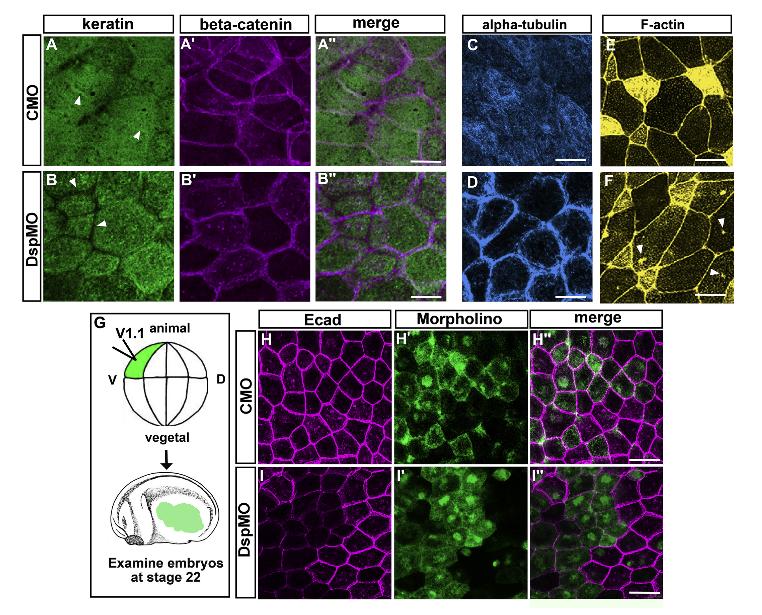 Fig. 6. A-Bâ²) Representative control and DspMO1 morphant trunk epidermis labeled with keratin (A,B; green), beta-catenin (Aâ²,Bâ; pink) and merge (Aâ²,Bâ²). Scale barsâ¯=â¯25â¯Î¼m. Beta-catenin labeling (pink) was used to provide a marker of the cortical region of the cell. C,D) alpha-tubulin labeling of cells from control (C) and DspMO1 morphants (D). Scale barsâ¯=â¯25â¯Î¼m. E,F) Phalloidin labeling of F-actin from control (C) and DspMo1 morphants (D). Scale barsâ¯=â¯25â¯Î¼m. G) Schematic of the experimental design for H-Iâ². H-Hâ²) Representative control trunk epidermis labeled with E-cadherin (J), showing the fluorescein labeled MO (Hâ²) and merge (Hâ²). Scale barâ¯=â¯25â¯Î¼m. K-Kâ²) Representative control trunk epidermis labeled with E-cadherin (I), showing the Fluorescein labeled MO (Iâ²) and merge (Iâ²). Scale barâ¯=â¯25â¯Î¼m. Abbreviationsâ¯=â¯Ecadâ¯=â¯E-cadherin. |