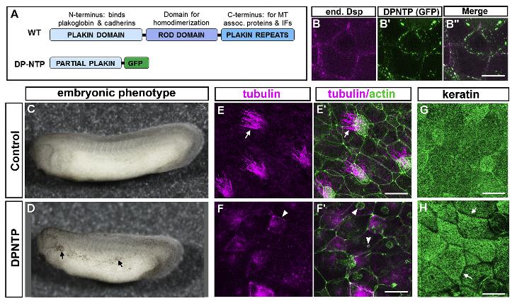 Fig. 7. DP-NTP expression in X. laevis embryos. A) Schematic of the major domains of desmoplakin in wildtype (WT) and DP-NTP construct. B) Desmoplakin labeled with an antibody Bâ²) DP-NTP-GFP expression Bâ²) Merge of B and Bâ. C,D) Lateral views of representative control (C) and DP-NTP expressing embryos. E-Eâ²) Trunk epidermis of a representative control embryo, labeled with tubulin (pink, E) and phalloidin (green) merged with tubulin (Eâ²). F-Fâ²) Trunk epidermis of a representative DP-NTP expressing embryo, labeled with tubulin (pink, F) and phalloidin (green) merged with tubulin (Fâ²). G,H). Keratin localization in the trunk epidermis of a representative control (G) DP-NTP expressing embryo (H). Scale barsâ¯=â¯25â¯Î¼m. |