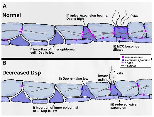 Fig. 8. Model of how decreased Dsp affects radial intercalation of the epidermis of Xenopus. Dsp (pink) connects with keratins (grey) and is increased during apical expansion. With reduced Dsp, the intercalating cell does not have properly localized keratins or apical accumulation of actin and the apical surface does not expand sufficiently. |