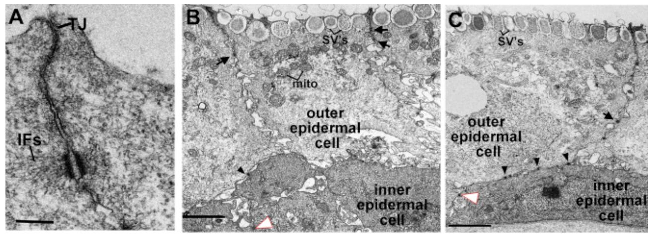 Supplemental Figure 1: Characterizing desmosomes in the developing epidermis using TEM. A) TEM image of a desmosome with filaments attached and a tight junction visible, scale bar = 660nm. B) Low magnification TEM image showing outer and inner epidermal cells at st. 30-31, scale bar = 2.5µm. C) Low magnification TEM image showing outer and inner epidermal cells at st. 40-41. Scale bar= 2.5µm. Black arrows indicate desmosomes located between outer epidermal cells, arrowheads indicate desmosomes between outer and inner epidermal cells and white arrowheads indicate desmosomes between inner epidermal cells. |
