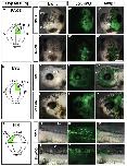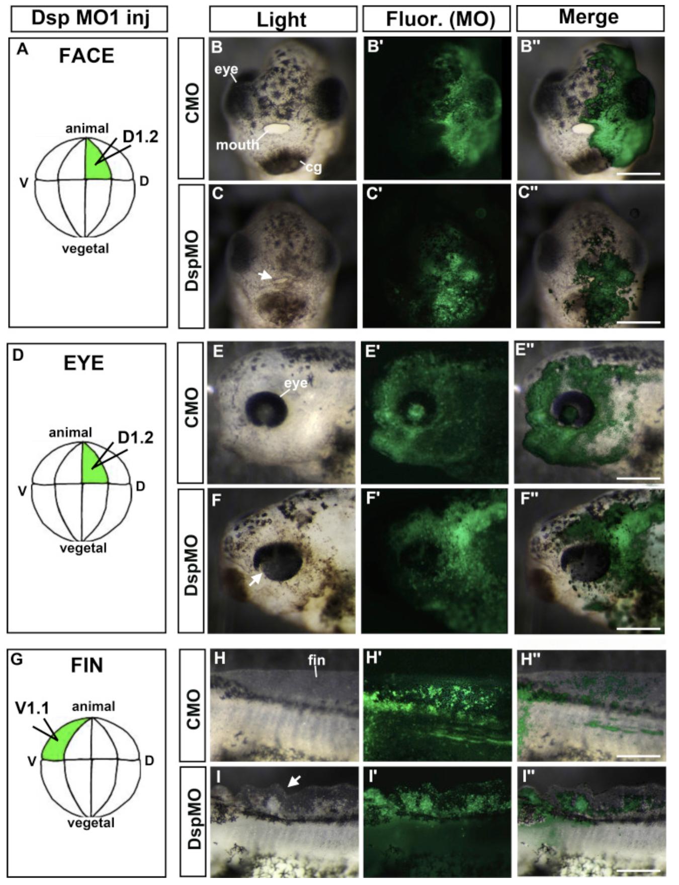 Supplemental Figure 4: DspMO1 targeted to the face, eye and fin causes developmental defects. All scale bars= 85µm. A) Schematic showing the blastomere injected with MO to target the face. B-Bââ) Frontal view of the face of a representative embryo with control MO in the face. Shows an embryo with light microscope (B), fluorescent (Bâ) and merge (Bââ). The embryonic mouth forms normally. C-Cââ) Frontal view of the face of a representative embryo with DspMO1 in the face. Shows embryo with light microscope (C), fluorescent (Câ) and merge (Cââ). The embryonic mouth does not form (arrow). D) Schematic showing the blastomere injected with MO to target the eye. E-Eââ) Lateral view of the head of a representative embryo with control MO in the eye. Shows an embryo with light microscope (E), fluorescent (Eâ) and merge (Eââ). F-Fââ) Lateral view of the head of a representative embryo with DspMO1 in the eye, shows embryo with light microscope (F), fluorescent (F') and merge (F''). The abnormal eye is indicated by an arrow. G) Schematic showing the blastomere injected with MO to target the dorsal fin. H-H'') Lateral view of the head of a representative embryo with control MO in the dorsal fin. Shows an embryo with light microscope (H), fluorescent (H') and merge (H''). I-I'') Lateral view of the head of a representative embryo with DspMO1 in the fin, shows embryo with light microscope (I), fluorescent (I') and merge (I''). The abnormal fin is indicated by an arrow. |