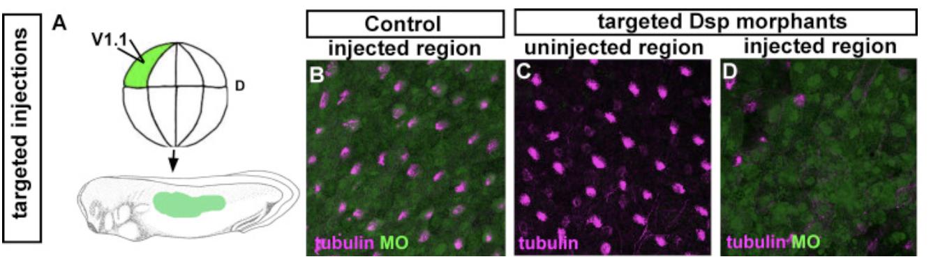 Supplemental Figure 5: Decreased Dsp specifically in the trunk caused a reduction in tubulin positive cells. A) Schematic showing the blastomere injected with MO to target the trunk epidermis. B) Trunk epidermis of a representative embryo with CMO, labeled with tubulin (pink) and showing fluorescent tagged morpholino (green). C) Trunk epidermis of a representative embryo with DspMO1, labeled with tubulin (pink) and showing region lacking fluorescent tagged morpholino (green). Scale bar= D) Trunk epidermis of a representative embryo with DspMO1, labeled with tubulin (pink) and showing fluorescent tagged morpholino (green). |
